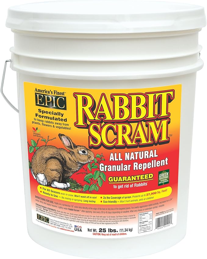 Rabbit Scram 25 lb. Bucket is an all-natural, granular rabbit repellent designed to keep rabbits away from gardens, lawns, and landscaping without harming plants or animals. Formulated with organic ingredients, it works by emitting a scent that naturally deters rabbits but is odorless to humans once applied. Safe for use around pets, people, and the environment, Rabbit Scram provides long-lasting protection and is easy to apply—simply sprinkle around plants, garden beds, or property perimeters for effective, eco-friendly defense against rabbit damage.
