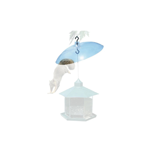 This transparent 16-inch squirrel baffler can be hung or pole mounted. When hanging the baffler, it blocks squirrels from above. The included hooks have the strength to hold up to 12 pounds. The top hook attaches the baffler to a tree limb or other hanging location, while the bird feeder hangs from the second hook located directly underneath the baffler.