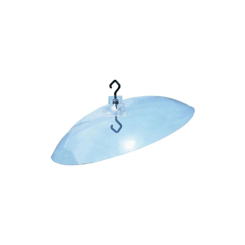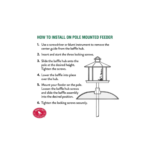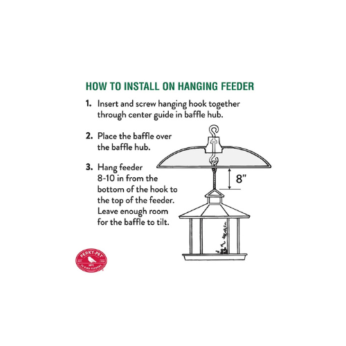 When placed on bird feeder poles, this baffler prevents squirrels from gaining access to the bird feeder from below. Squirrels may try to climb up to the feeder, but they won’t be able to get around the baffler without landing on the ground. To pole mount this baffler, simply lower it over the top of the pole and screw it into place. About a foot below the feeder is the best option. All supplies needed for either hanging or pole mounting is included: a 16-inch-diameter transparent shield and all hardware (2 hooks, 1 baffle hub, and 3 screws).
